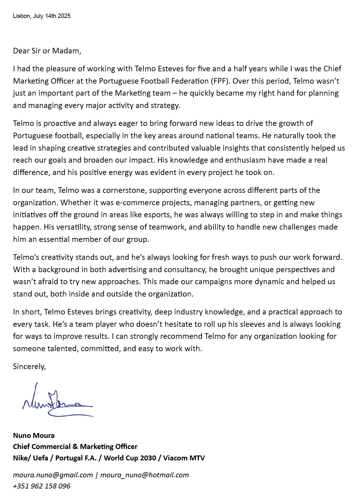 Senior Marketing Manager at the Portuguese Football Federation, responsible for the strategic development and execution of brand and campaign initiatives across key properties, including the Portuguese Football National Teams, Portugal Store (eCommerce), Portugal+ (Fan Club), and FPF eFootball (esports). Serves as the primary liaison with advertising agencies, production companies, photographers, and videographers, and collaborates closely with sports partners (Nike and Puma) for new collections launches.